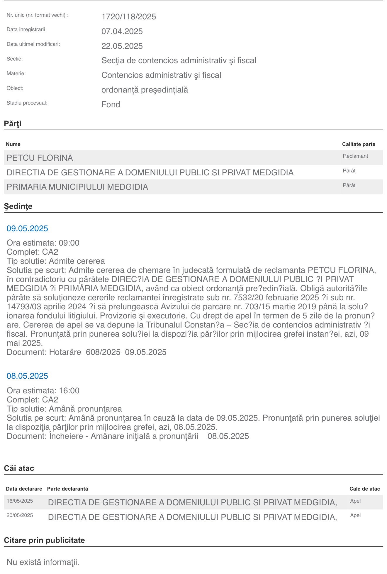 Florina Petcu s-a trezit evacuată de pe locul plătit, angajații ADP demontând indicatorul de „Rezervat” și Poliția Locală asistând la înlăturarea ei, în loc să-i apere dreptul. Femeia a ripostat în instanță și a învins: Tribunalul Constanța a obligat de urgență ADP să-i prelungească avizul, considerând refuzul nejustificat, iar Curtea de Apel a menținut decizia. Cu toate acestea, ADP a încercat să blocheze hotărârea, contestând-o fără succes. Între timp, cazul a căpătat și o dimensiune penală – procurorii au deschis dosar penal pentru abuz în serviciu pe numele șefului ADP, Nicolae Tutungiu.